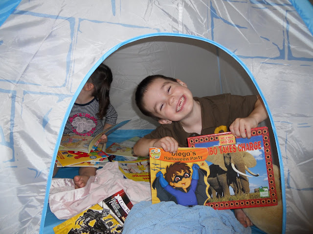 Today we took a trip to good old D.I. Do you think every D.I. in the entire nation smells the same? Because I do. I don't know if it's the cleaning products or what...I could pick out that smell from a mile away. We needed something fun to do today (Let's go to D.I.! Yes! That will be fun!) so we headed over there and picked out some books. Someone had just dumped off a bunch of Clifford books, which we love, and we also got some great Mercer Mayer and a few others I was excited about. We grabbed a treat at Wal-Mart and then took them home to read in our little tent. It was a success...we'll have to do it again.